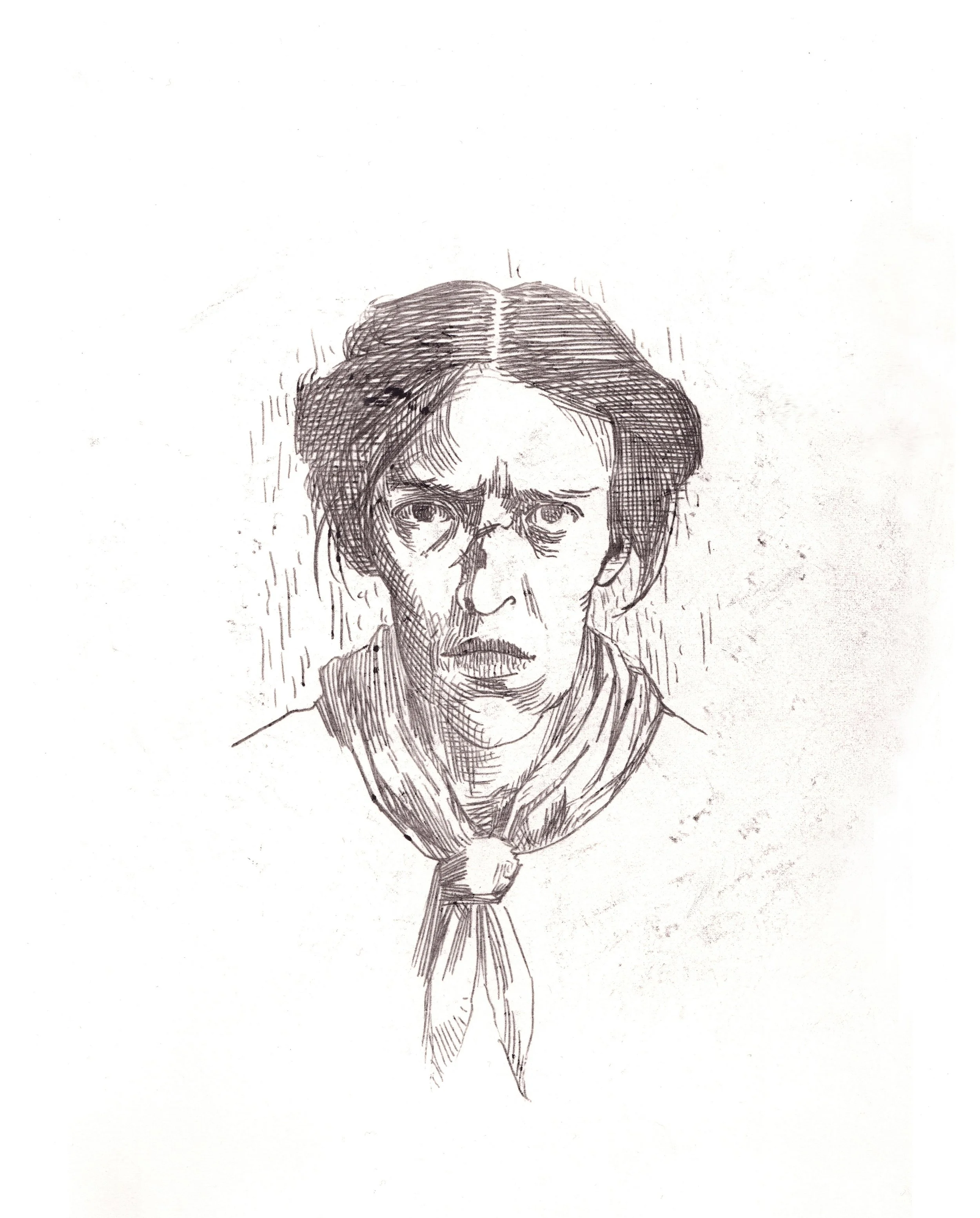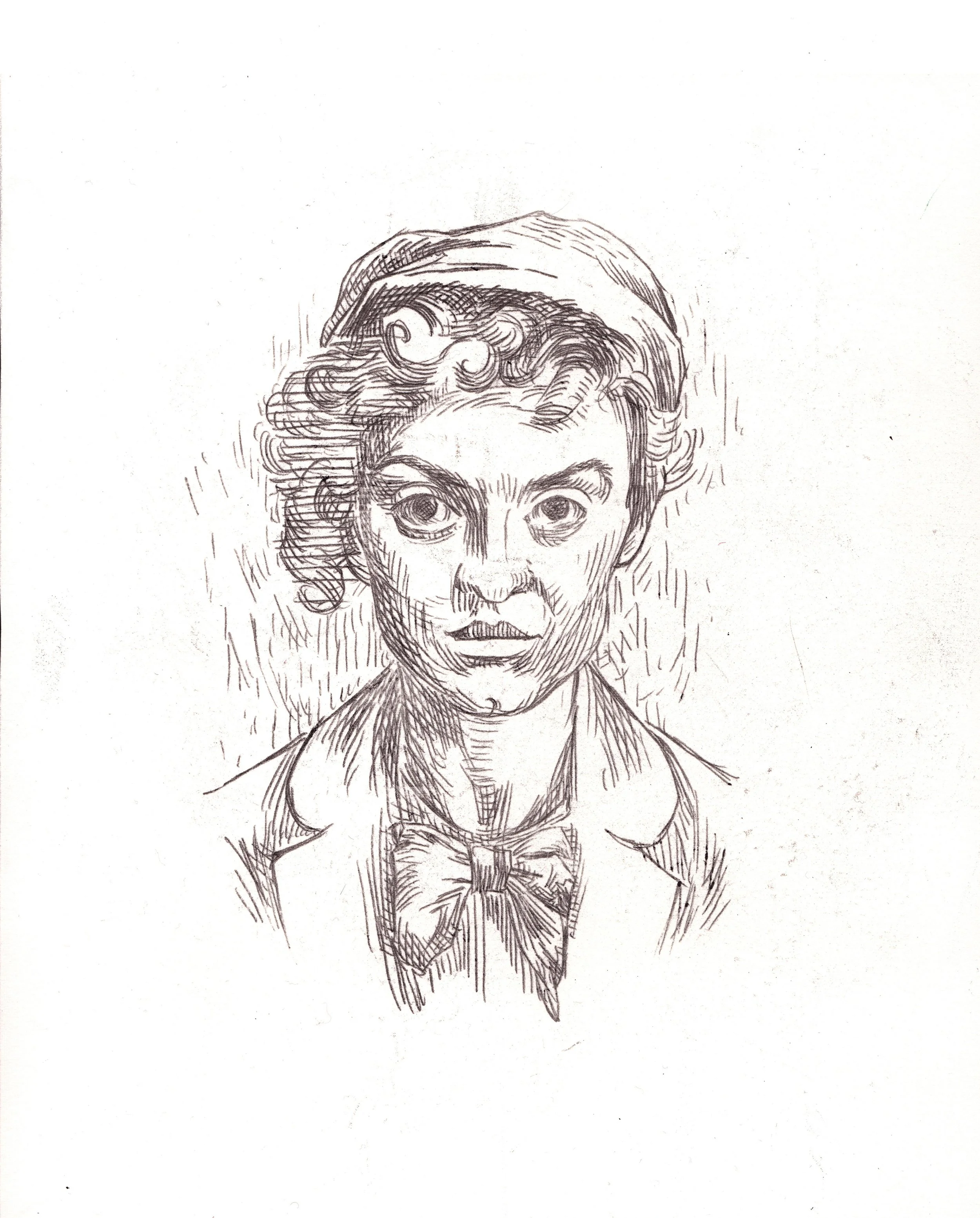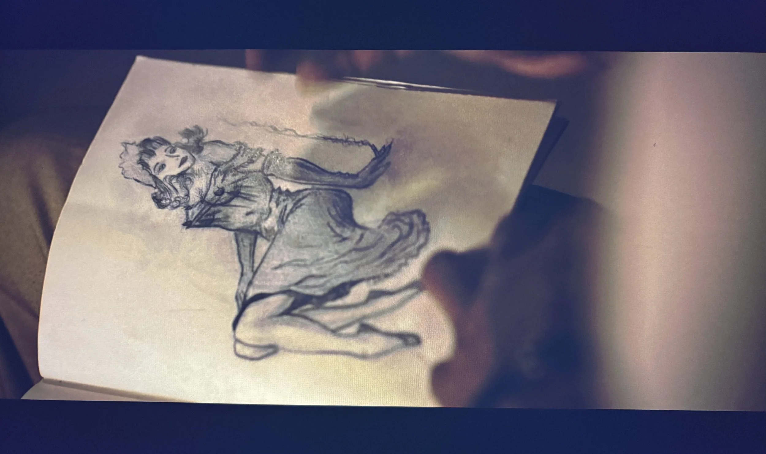 The image shows three images. The top one is a promotional poster for the movie "A Christmas Carol," featuring a man in Victorian attire with a top hat, standing in front of a ghostly figure with large hands reaching out. The bottom two are pencil sketches: the left one is a portrait of a young boy with short hair and a collared shirt, and the right one is a portrait of a woman with long curly hair, also in a collared shirt.