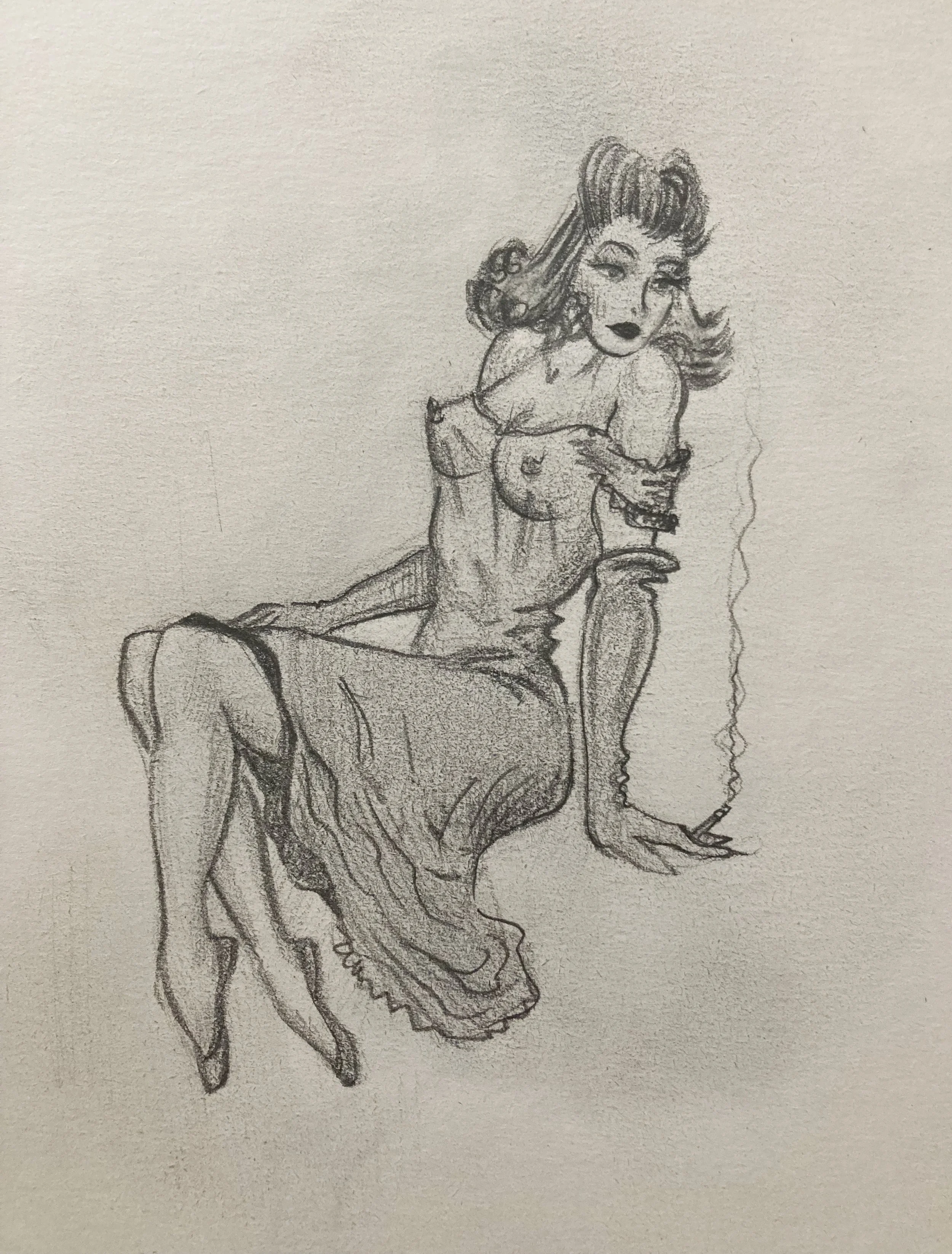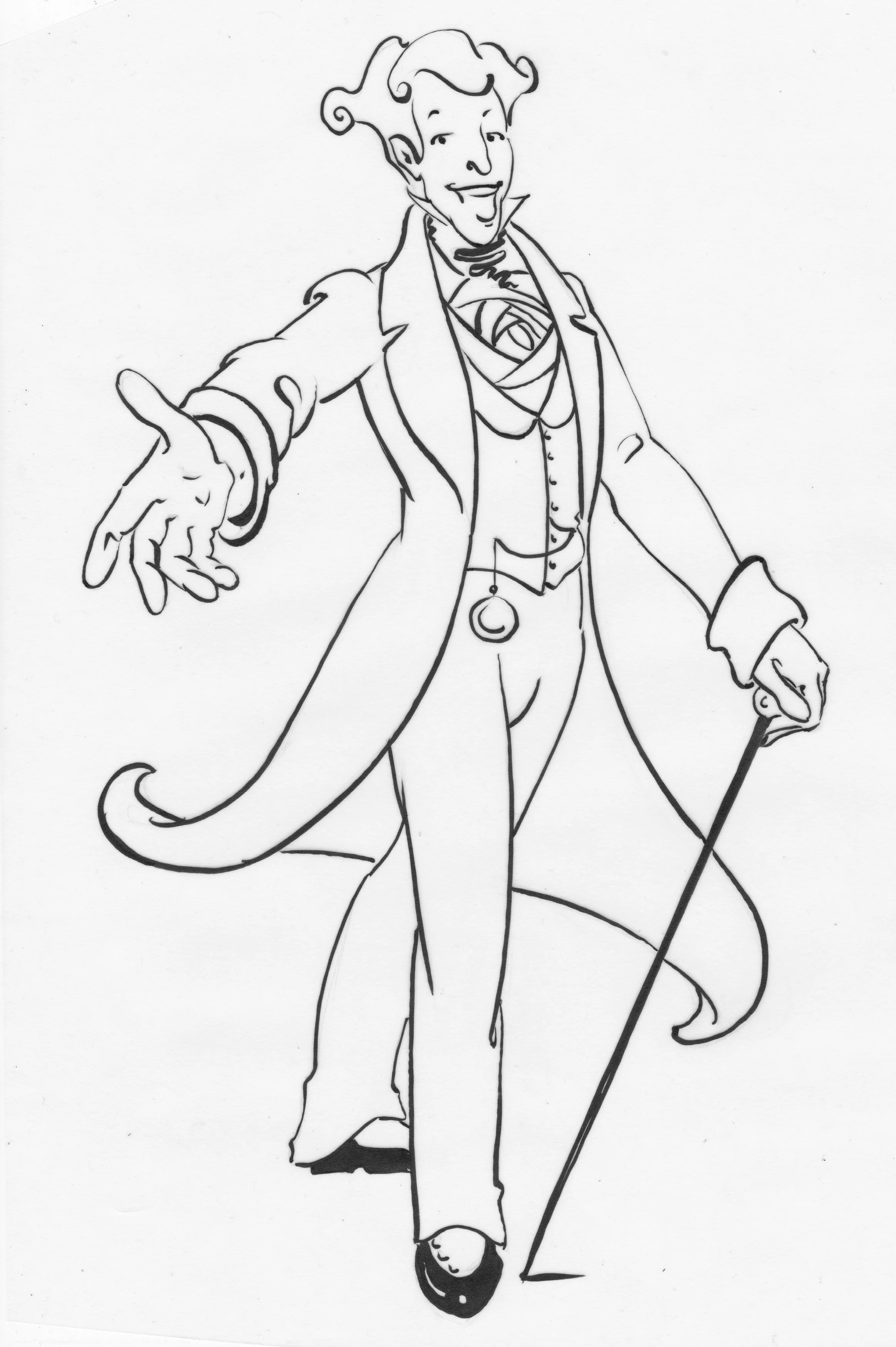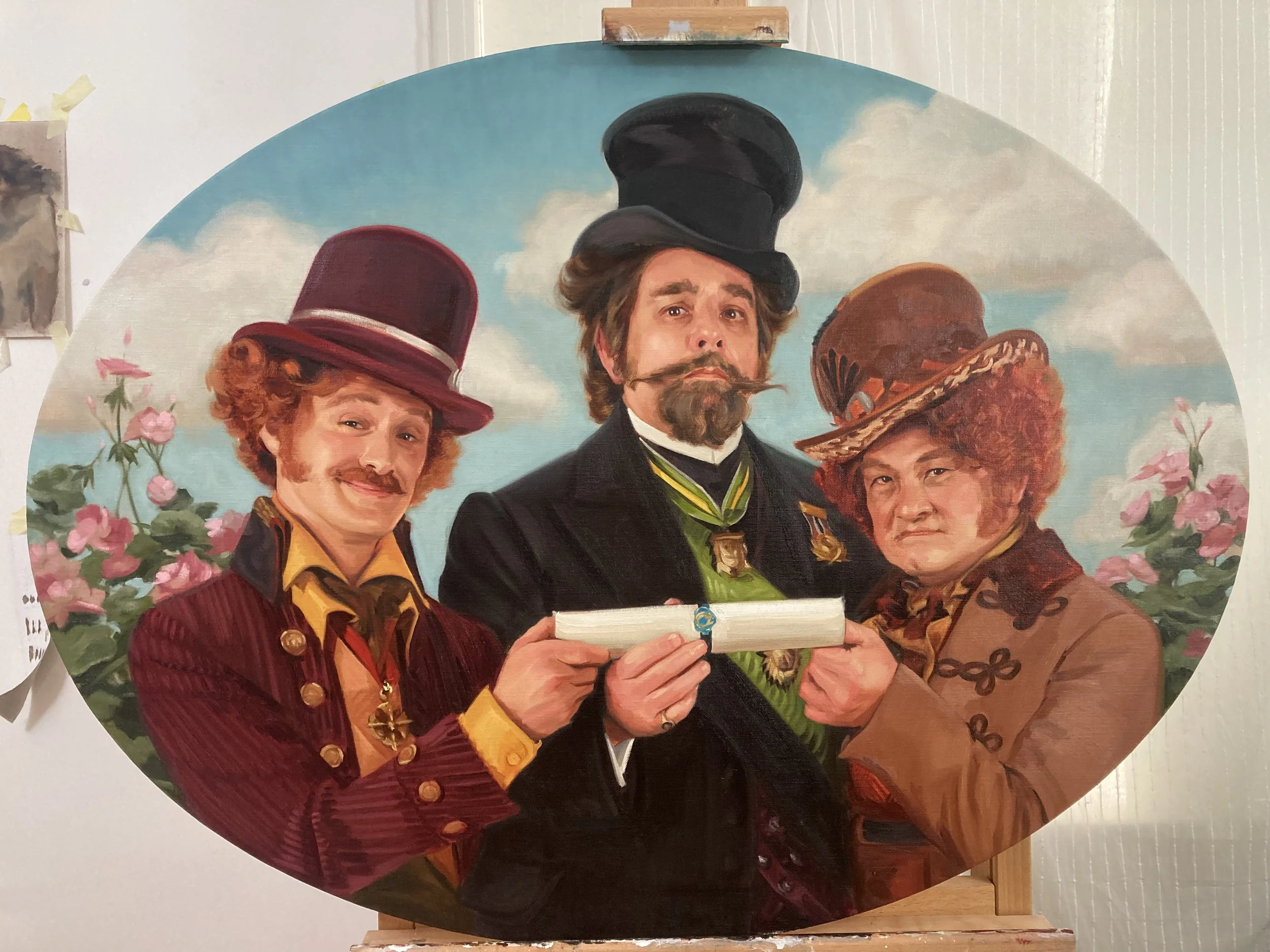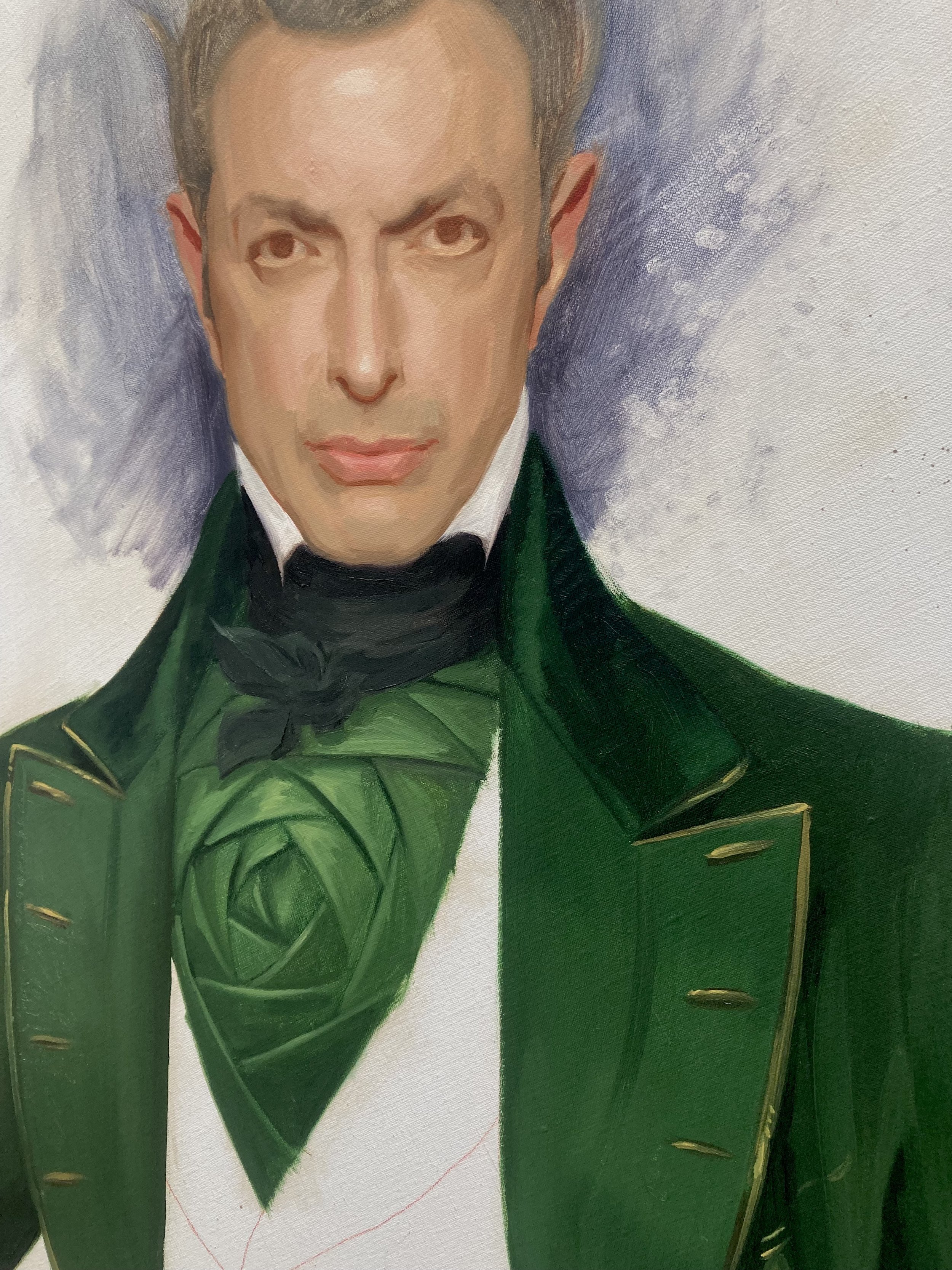 A partially completed chalk art of a man in period clothing, with an additional photo of the same man on a clipboard nearby, and art supplies scattered around on the floor.